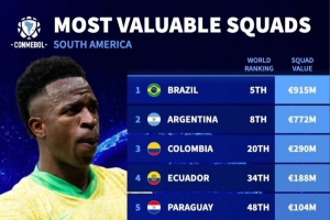 体育资讯10月12日讯 德国转会市场网公布南美足联国家队身价排名,巴西队以9.15亿欧元总身价稳居榜首,世界杯冠军阿根廷队以7.72亿欧元位列第二。
