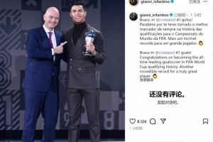 C罗职业生涯至今世预赛打进41球,独享世预赛历史射手王荣誉,国际足联主席因凡蒂诺社媒晒出与C罗的合照,对他表示祝贺。